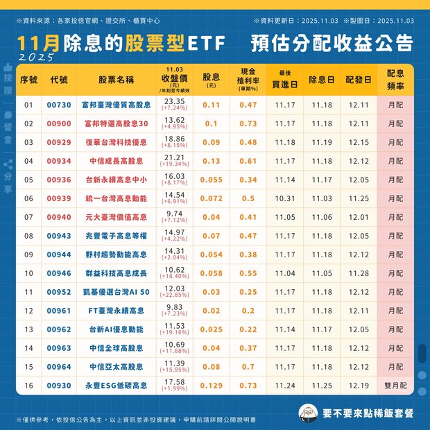 更多11月ETF除息名單資訊:2025年11月除息ETF懶人包|00878、006208最新配息金額!