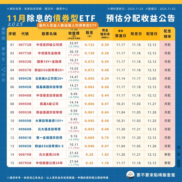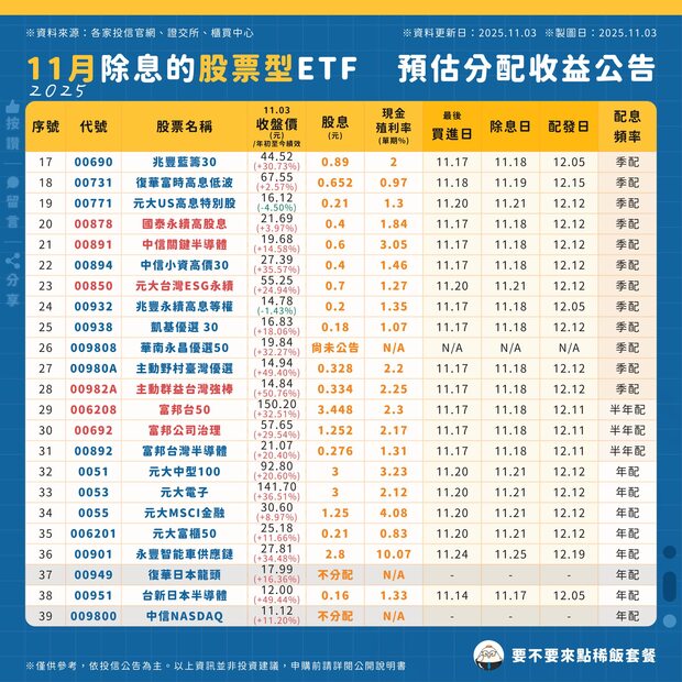 11月除息的ETF公告囉!這次名單也是超級多,不只是高股息、市值型ETF,連主動式ETF都紛紛加入戰局。本文整理39檔股票型ETF與15+檔債券型ETF,配息資訊一手掌握。