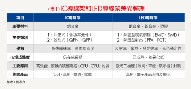 導線架依應用領域不同,可分為IC導線架和LED導線架2類,彥良將兩者的差異整理如下表所示: