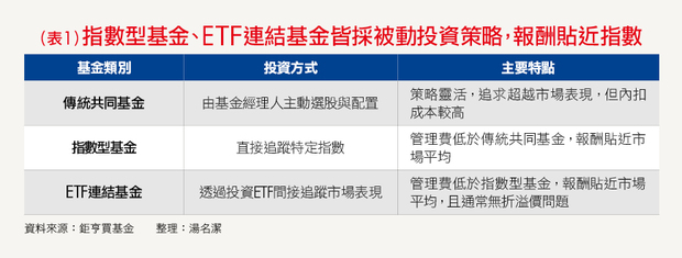 專家表示,近年在人工智慧(AI)等科技題材帶動下,全球資金積極配置於股市,其中,指數化投資工具因操作簡單、費用較低,在長期資金流向中的份量愈來愈重。值得注意的是,不論是基金或ETF產品,都有主動與被動之分,譬如以被動追蹤指數為主的ETF,2025年時已有多檔主動式ETF在台灣證交所上市,標榜由基金經理人選股、選券;由經理人主動操作的共同基金,同樣也有指數型基金、ETF連結基金這2類被動式產品,可追踨特定市場指數(詳見表1)。