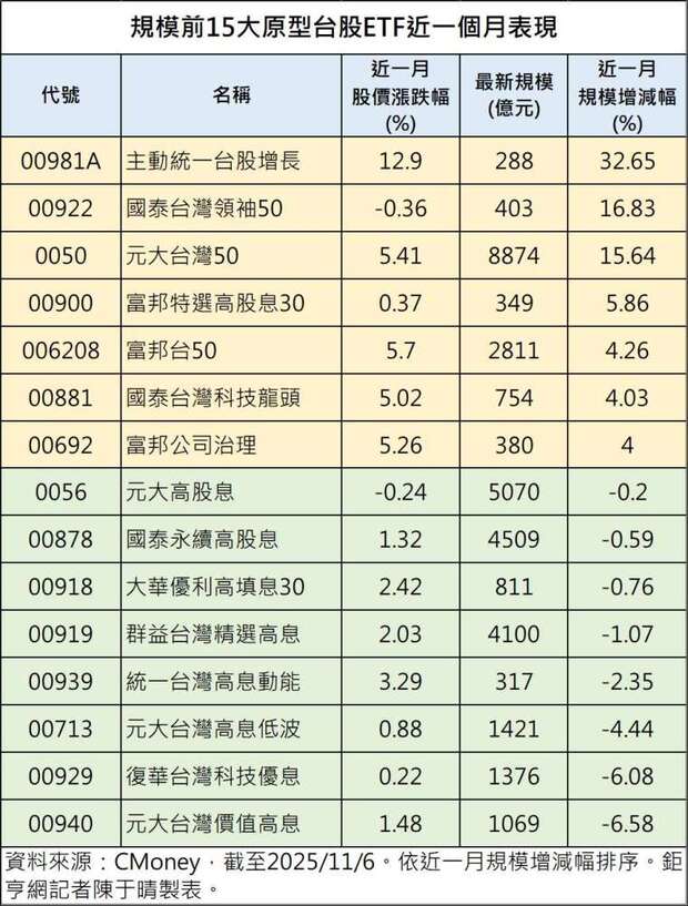 68檔台股原型ETF近1月資產規模大洗牌!主動式台股ETF主動統一台股增長(00981A)一舉躍升至第15名。