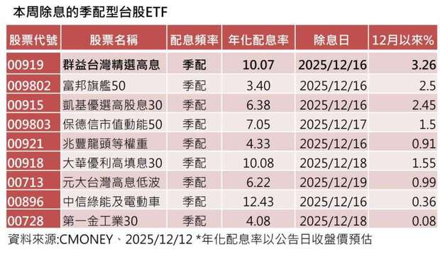 2025年最後一波台股ETF除息旺季登場,統計本週15日~19日將有包括群益台灣精選高息(00919)、元大台灣高息低波(00713)等共9檔季配型台股ETF展開除息,吸引逾217萬位受益人關注。