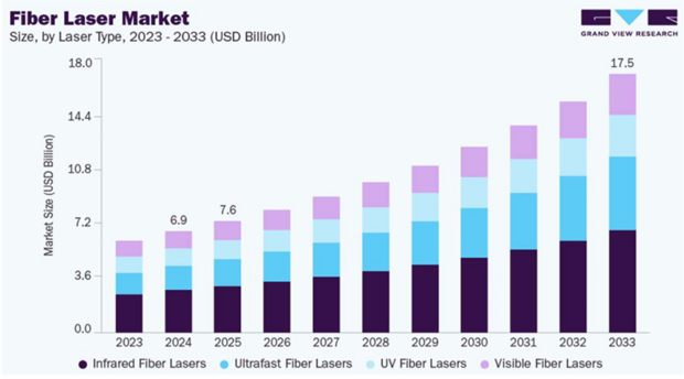 萊德光電所處的市場,都是中長期看好的市場。其中,光纖雷射在2025年的市場規模為76億美元,到了2033年將成長到175億美元,年複合成長率為11%。至於在低軌衛星方面,2023年有7,000多顆衛星在低軌道運行,到了2032年將高達4萬顆以上,年複合成長率達超過2成,加上低軌衛星大約每5年就要汰換,對相關元件需求成長強勁。展望未來,包括6G、低軌衛星、雷射通訊與高功率光纖雷射等領域,都將推升萊德光電營運成長。