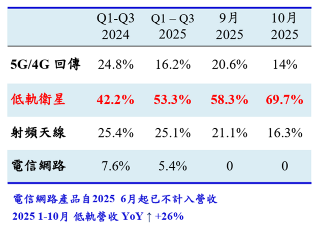 昇達科的四大產品線包括5G及4G回傳網路、低軌衛星、射頻天線以及電信網路。其中,低軌衛星是公司非常重要的產品線,占2025年前3季營收比重已經超過5成。而在2025年10月,低軌衛星占昇達科營收比重更來到將近7成。累計2025年1到10月,低軌衛星營收較前一年度增加26%,成長動來自SpaceX以及亞馬遜積極發射低軌衛星。