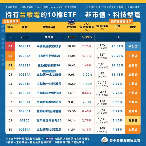 至於其他投資台股的主動式ETF,像00981A、00982A、00984A,其實也都有配置台積電,只是比重各有不同。而主動式ETF現在有台積電,不代表未來一定會一直有,配置本身是可以隨市場調整的。