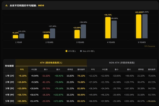 做法其實很簡單:把過去每一天分成「歷史新高日」與「非新高日」,分別模擬如果你在這2種日子買進,持有1年~5年後的報酬表現。