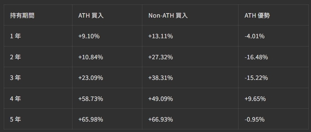 而且不是只有5年期,從1年到5年,每一個期間,買在高點的報酬都更高。