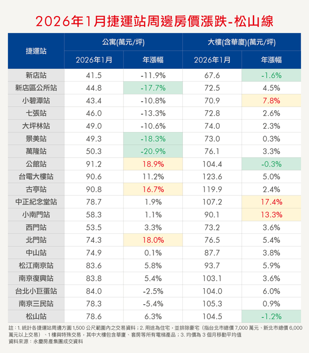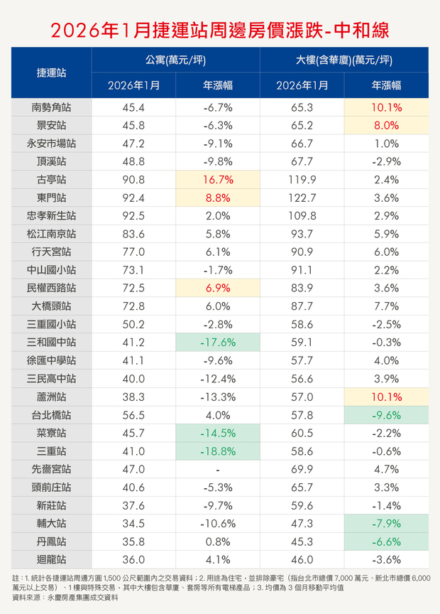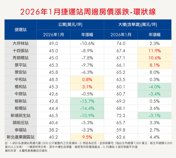 入住捷運宅,是不少人的購屋目標。為讓消費者有第一手訊息,《Smart智富》與永慶房產集團合作,每個月彙整各捷運站點周邊的公寓、大樓房價,並計算年增率。本月統計2025年11月至2026年1月的均價。