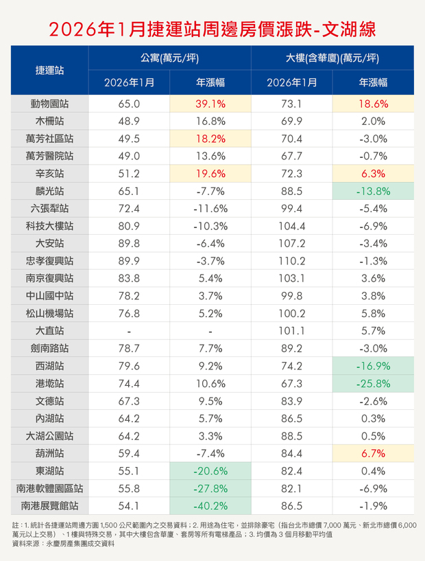 以大樓價格來看,文湖線多數站點表現平穩,僅少數站點如港墘站、西湖站、麟光站及動物園站有明顯波動,推估為特殊的個案交易影響,非全面性系統問題;至於公寓部分,愈往末端站,交易量通常愈低,加上普遍而言公寓的條件差異大,使得價格波動幅度相對明顯,如南港展覽館站、動物園站甚至出現近4成的年變動幅度。