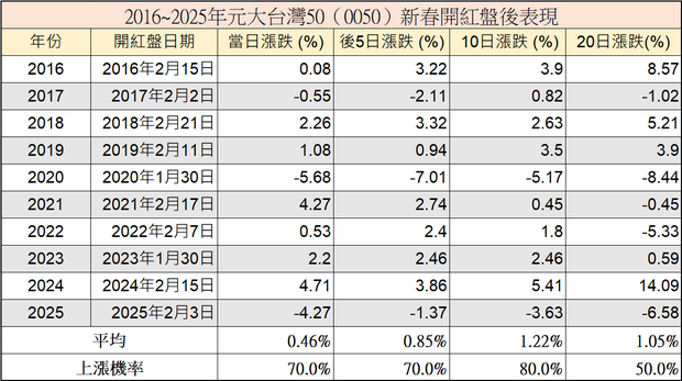 以下為台灣元大50(0050)近年來統計新春開紅盤後表現: