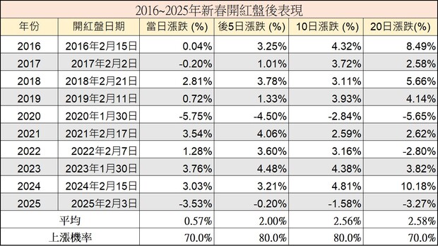 為了回答這個問題,我統計了2016年~2025年這10年間,台股新春開紅盤的表現。數據呈現出一個非常有趣的現象: