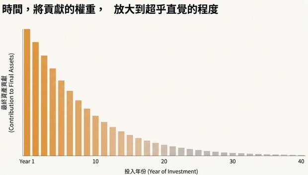 第一年投入的1萬,因為有40年的時間滾動,到最後可能長成約14萬美元。它只占總本金的2.5%(1/40),卻可能占最終資產的約7%。