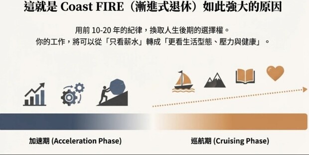 它的核心不是鼓勵你提早躺平,而是提醒你:如果你能在年輕時的10~20年,把儲蓄率拉高、把投資規律建立起來,讓資產跨過一個足以自我增長的門檻,後面的人生選擇就會多很多。