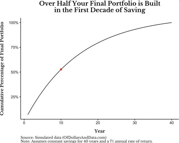 在一段40年的投資旅程中,前10年的投入,可能就占了最終資產的一半以上。