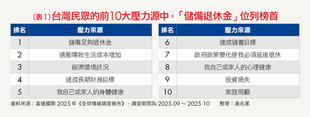 你比較擔心眼下物價上漲,還是未來錢不夠用?一項針對台灣民眾的調查報告顯示,2024年時,「通膨推升生活成本」高居壓力排行榜之首,但到了去(2025)年下旬,最多人擔心的事已變成「退休儲蓄是否足夠」(詳見表1)。這個轉變,意味著國人的焦慮源頭,正從短期的物價波動,移向更長期的財務安全。