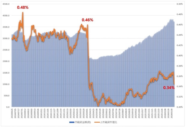 近期台股融資餘額升至3,700多億元,引發市場是否過熱的疑慮,但單看絕對金額並不準確,應與台股市值對照。歷史顯示,當融資市值比接近0.5%時才易出現修正,如今台股市值達108.1兆元,融資市值比僅0.34%,仍低於警戒線。顯示市值成長快於融資增速,籌碼槓桿未過熱。