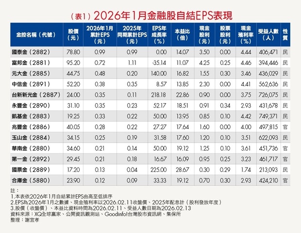 13家金控2026年元月獲利累計EPS表現全數出爐!金控獲利王會換人當?