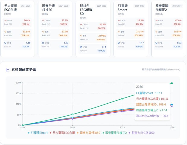 台股開市,不少爸媽思考替孩子長期投資ETF,市值型ETF如元大臺灣ESG永續(00850)、國泰台灣領袖50(00922)、群益台ESG低碳50(00923)、FT臺灣Smart(00905)近年績效差距都不大,適合穩健累積。