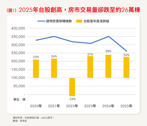 股市、房市兩樣情!2025年台灣股市創新高,加權指數上漲逾2成,反觀房市,交易量不僅創下9年來新低,七都房價也在央行於2024年9月宣布第7波選擇性信用管制後,出現明顯回檔。然而,從央行總裁楊金龍近期的談話來看,「多數理事都認為目前房價沒有跌很多,還有修正空間」,業者分析,管制措施短期內恐怕沒有退場機會,預期2026年房市將呈現「量盤整,價緩跌」的格局。