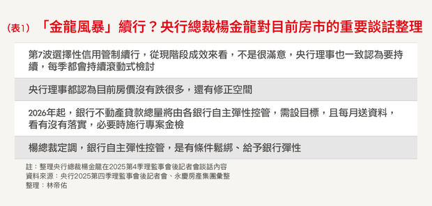 不過,即便市場冷清、房價已出現修正,陳金萍認為,短期來看,第7波選擇性信用管制仍未有明確的退場時間表。主要原因在於,央行於2025年12月召開理監事會議,會後記者會中,總裁楊金龍的談話透露出「對目前房價仍不滿意」的訊號(詳見表1)。多位理事也指出,雖管制措施已有初步成效,但房價所得比及房貸負擔率仍偏高,故需持續觀察、滾動檢討。