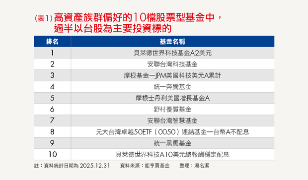 值得注意的是,在表1所列的10檔基金中,以台股為主要投資標的者,即占了6席,這個比例,清楚傳達了資產階層對台灣科技動能與產業競爭力的信心。