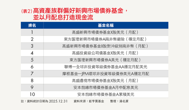 至於用以平衡股市波動的債券型基金,他們的選擇同樣不保守。持有最多的前10大債券型基金中,有7檔為新興市場債券基金(詳見表2),這顯示即使是防禦類資產,高資人士仍偏好收益潛力較高的標的,而非僅追求穩定。
