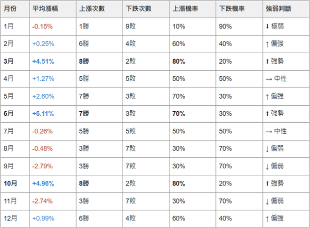 1月:勝率僅10%(1勝9敗),平均-0.15%,是全年最弱月份,幾乎「1月必跌」。