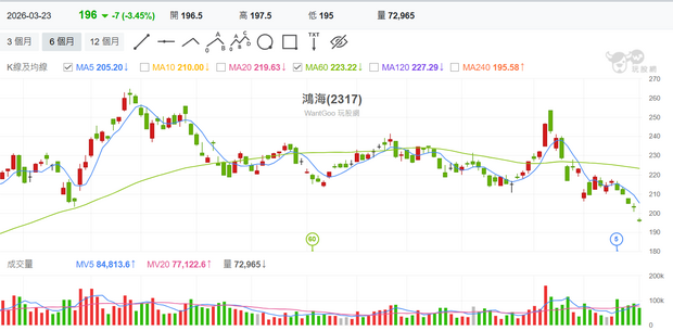 2026年3月23日,鴻海(2317)失守200元關卡!以收盤196元,正式跌破240日均線(年線)約197元,創下半年來的低點。從2025年10月底的歷史高點 265元計算,這波下跌已達 26%。